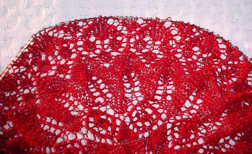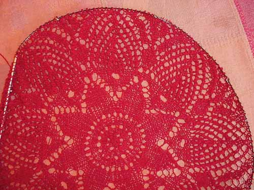 Putting the curtain project on the back burner to stew a while, I turned back to knitting this weekend past. First, having time, and Older Daughter around to do photography that requires extra hands, I was able to do the final graft/join on the larger red doily, uniting the final row of my edging with the cast-on edge.