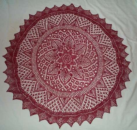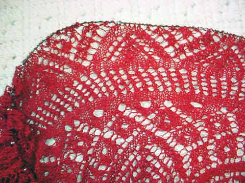 To embarrass myself, I went back through blog archives looking for when I knit this third red doily but didn’t find it. I think was knitting this piece back in the fall of 2006, and it has been sitting in the blocking pile ever since. That’s so long ago, I’m not sure where the pattern is from, but I think it might have been from Patterns for the Art of Lace Knitting: The Complete Works of Rachel Schnelling, compiled by Gloria Penning.