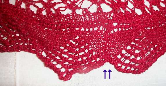 So not being able to leave well enough alone, I played with the thing, centering the arrowhead shapes in the areas between the leaf/tulip points. I haven’t changed the motifs – just shifted them to the left by a couple of stitches so they align between the ribs formed by the center stitch of the leaf/tulips. I think it’s an improvement: