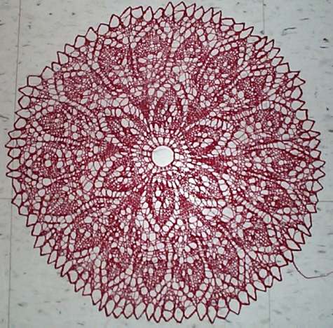 Because I had the blocking sheet out and had some room, I grabbed another piece from my done-and-waiting pile and blocked it, too. Here’s Red Doily #3, knit last year, pinned out and presented done (but with some ending off still on the horizon)