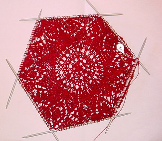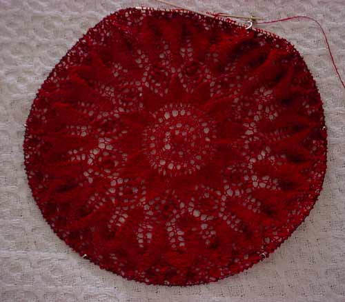 I suppose I could haul out coasters or adapt one of the dining room placemats. But why overlook a perfectly good opportunity for the application of knitting. So it’s off to the stash to get my massive amount of red lace-weight, left over from Alcazar (rayon but borderline washable and expendable), then hunt down one of Nurhanne’s translations of a traditional Danish doily. Yes, I know. It’s red, not the classic white. But hey. Red won’t show wine spills as quickly.
