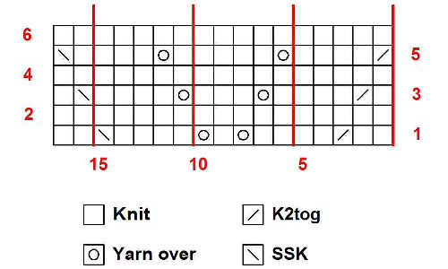 Here’s the graph for the ultra-simple six-row feather and fan variant used on the ankle. It’s 17 stitches wide and six rows long. I’m working my socks on five needles (four in the sock, one to knit with). Because each needle has 17 stitches on it, this graph is worked once per needle: