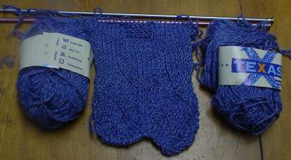 I’m using Almedahls Texas. It’s a 100% cotton in faded denim type colors (50g, 105m, color #30). I’m already fearing running out of the stuff as The little bit you see – about two inches of hem facing plus four rows of the main body) is more than half of the first ball. That’s in spite of having 18 balls – about 2060 yards, which should be a ton. In theory…