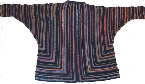Now this isn’t going to be as huge as the coat (that’s big enough to be a blanket with sleeves); and I probably will make it in one piece rather than a right and left, joined at the spine. But it will use the same idea of the outside edge and in working logic. The first strip will proceed from the shoulder into a wide V-neck, and down the front center, then mitered at 90-degrees, across the bottom of the hem and all the way around the back, returning to the front, climbing back up the front center and ending at the opposite shoulder. If I do this right it will work out not unlike a Surprise Jacket, with the only seaming being across the top of the shoulders..