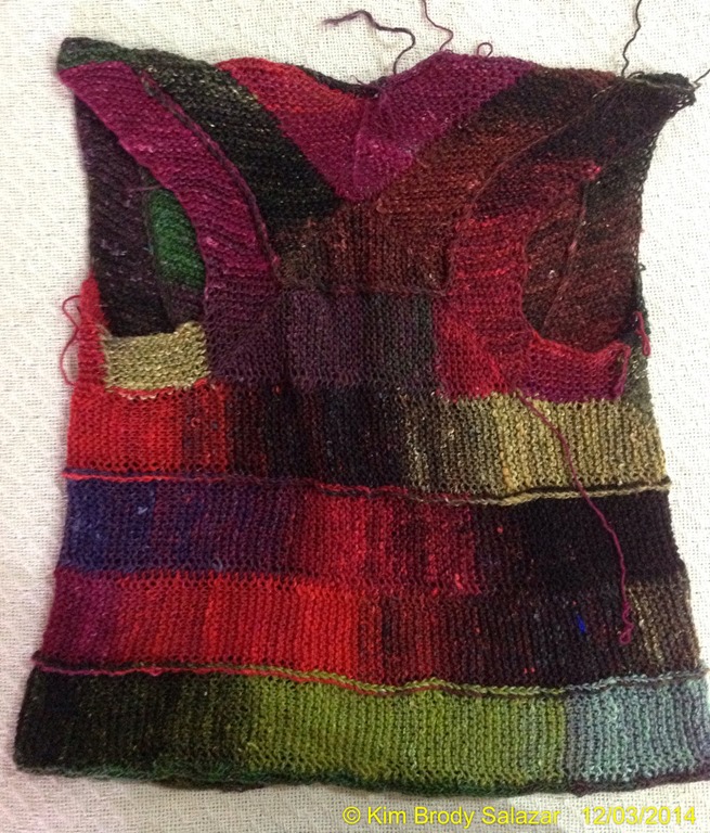 I will continue in this manner for one more strip. That will make the shoulders of the piece about as wide as the shoulders of the target tee-shirt I am using as my size model. At that point I’ll have to figure out how to fill in extra bits on the sides and in the center of the back. But so far the thing has come together exactly as I envisioned. And quickly, too!