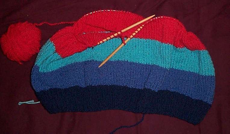 I don’t have any more of the navy blue, so I’ve started the cuffs in the darker of the two greens. They’d make an incomprehensible and boring photo right now, all muddled up on a very springy circ, so I’ll spare you that image. The color progression on them will be (more or less) the same, but because they are three inches shorter, they will probably end with the deep green at the top, too. And yes – I did calculate the stripe widths so that the turquoise one that spans the top of the shoulders and that is seamed up the center is the same width as the other stripes after assembly.