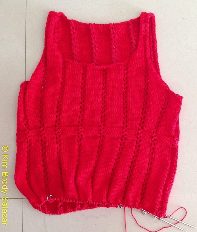 The red top-down pullover, of course. I’ve finished both sleeve caps. They were worked onto the body rather than seamed on later, and were done both using the short-row method described in the pattern. More or less. There was some fudging and work-arounds to maintain the lacy rib pattern, and I ended up having to do an extra row after pick-up because try as I might, I could not pick up as few stitches as were specified without leaving unsightly gaps and puckering. So, I picked up an appropriate number (mid way between my chosen size and the next one up), then worked an additional row of strategically placed decreases to slim the count down to the pattern’s number. That means my lacy rib starts one row after the seam instead of butted up against it, but unless I point that out, it’s not noticeable. (Oops. I just did.)