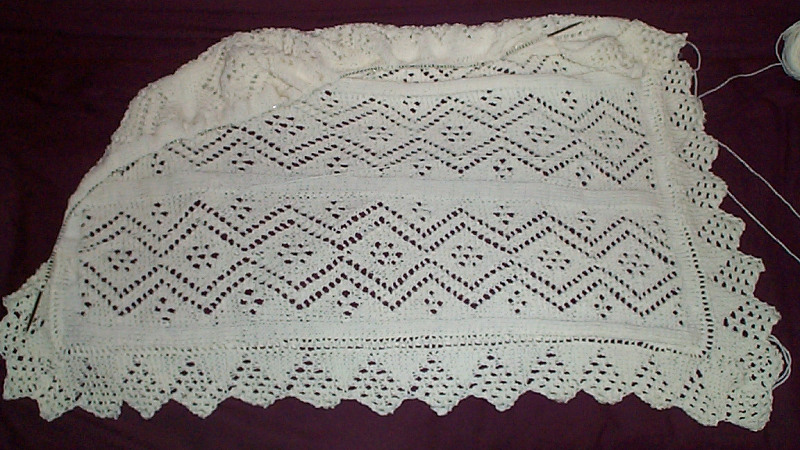 On the lace shawl, as predicted, I ran out of yarn. But Friend Dena has graciously offered up a some more to complete. As you can (sort of) see below, all I need to do is finish the final edging.
