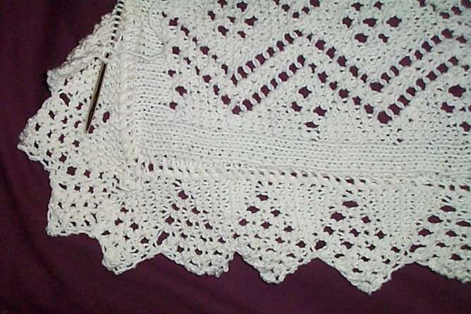 More on corners. Using the same principles as the knit-from-center-out framing area on my cashmere shawl, I’ve done a mitered corner on my baby blanket. I do envision a problem now that I’ve finished a credible Corner #1, but I’ll deal with it when I get there.