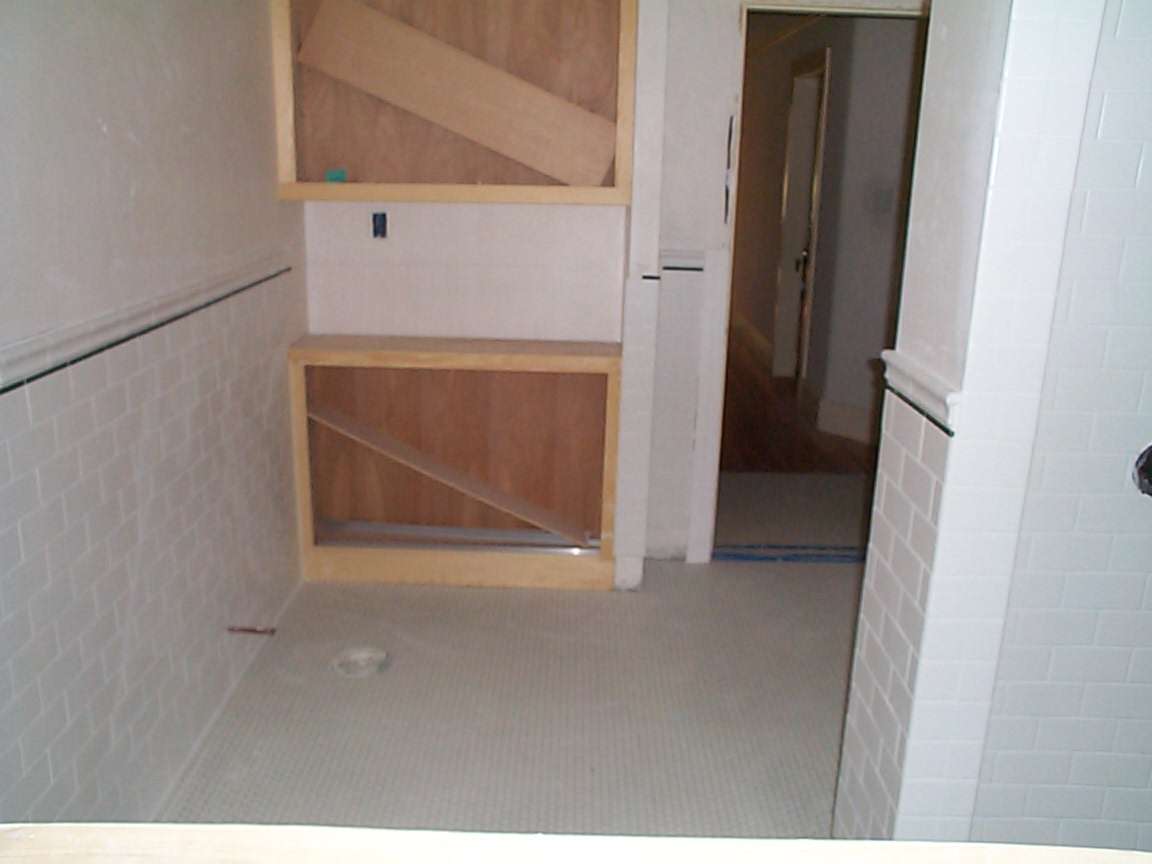 And finally – progress on the bathroom front. Which is a good thing because washing one’s hair in the sink can get old after five weeks. The tile is now (mostly) up and grouted. Vanity, storage cabinet, fixtures and finish work are left: