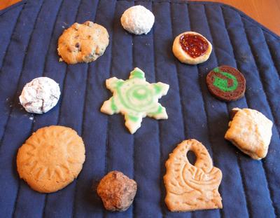 Long time readers here will remember that December can’t happen without sufficient cookies. Ten kinds. This year, plus panforte and fudge. Which makes quite a pile on the sideboard: