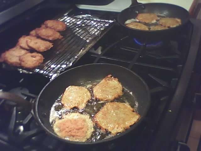 Two pans going. You can see how thin they are, and the crunchy, lacy edges formed when the very runny batter spreads in the hot oil. Yum.