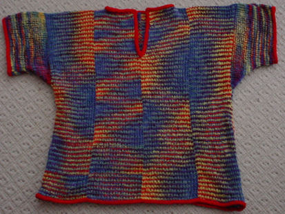 So to sum up, there’s a use for almost every multicolor yarn. Things that make using multicolors easier include harmonious, balanced color sets (even if they’re bright), and a minimum of muddy areas. Introducing movement by stitch direction or by narrowing the strip being knit can be more interesting than the same yarn knit totally flat in stockinette. It IS possible to use texture patterns with multicolors, and even the most savage multicolor can usually be tamed by introducing a background or contrasting solid.