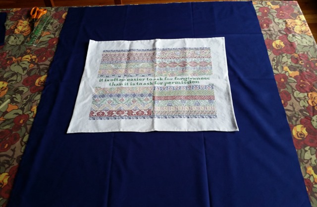 Why do this? To make sure your piece is neatly aligned on the cloth. It’s less vital on this project than on a sampler or other item you wish to frame, but it’s a good habit to get into, and will save you headaches down the road.