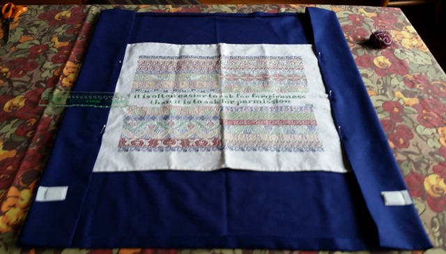 Now that last step can be done in several ways. The easiest is a simple whip stitch or invisible hem. But I never take the easy way out. Instead, I went back and extended the green double running line that defines the top and bottom edge of my stitched area out along my fold. I couldn’t put the thing back into the frame, so I did it in hand. Then having two green lines established, I used the same green embroidery floss to work them together, following (more or less) the logic that people who make biscornu use to seam together the two squares that form their curious little pincushions. A good tutorial for that is here.