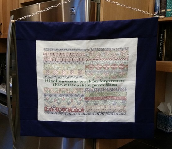 And so, taaa daah! A small book with a nifty cover. A stitched project that doesn’t take up wall space, that can be adapted to any size book you have on hand. Embellish a devotional book that means a lot to you; or at the other end of the spectrum, disguise a racy novel for discrete subway reading. Use any pattern that tickles your fancy. Or several if that’s what speaks to you. But whatever you do – enjoy, be creative, and feel the pride in coming up with something that’s specifically and personally meaningful to you.