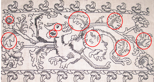 And this bit, stitched from a Lipperheide book, is the absolute poster child for discontinuity. I didn’t mark them all, but you get the idea. The spaniel and possibly that center bundle thing are the only bits large enough in which to bury the ends, if a fully two-sided result is desired.