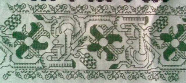 First off, I thank long-time Needlework Pal Kathryn for letting me use a snippet of her recently released redaction of a Lipperheide design. Because this design is so difficult to work out, I am using her stellar rendition as a “poster child” for a complex design drafted out using standard tools. Kathryn uses Pattern Maker by Hobbyware to chart. It produces a standard grid, and is largely intended for cross stitch. But with a a bit of work its outlining feature can be used to depict linear stitching (back stitch or double running). With even more tweaking those outlines can be made thicker so they read better against the background grid. Here’s a snippet from a chart she recently released.