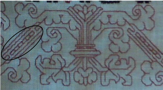 The knot element in the all-over at left is not attached to the main pomegranate frame. It is however just large enough manage thread-end-hiding. So while its presence makes this a tedious and difficult pattern for double-sided double running stitch, it is not a deal breaker. However those little accent diamonds are deal breakers. Too small to hide the ends, and detached from the main design. The ladder element in the arms of the repeat at right is broken from the main design, and is too small for end-camouflage.