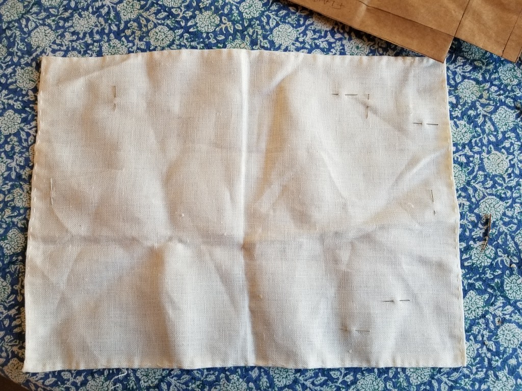 I set my pattern down on my ground cloth and eyeball its placement. Then I insert pins to mark the edges of my to-be-stitched areas. In this case, although it’s optional, I also pinned out the location of the flap edges. Then I basted along the even weave grain, along the lines described by the pins. Note that I needed only ONE pin to denote each line: