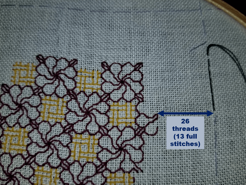 Lucky me – it turns out that my basted edge falls exactly 13 stitch units (26 threads) from my established work. Had there been an odd number of threads I would have established my line one thread to the outside of my basted line. Better a tiny bit too large than a tiny bit too small. And yes, I counted the number of threads between the top basted line and the established work, too. It’s even bigger, so I am safe.