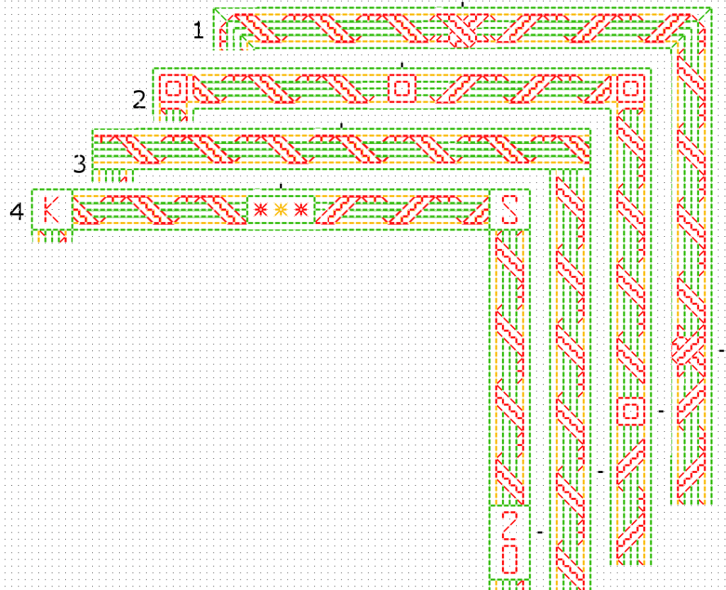 How do I go about using my aberrant method? Sadly, it’s not supported by any commercial needlework charting program at either the consumer or professional level. Instead I use a standard open source drafting program – GIMP, and a system of templates and predetermined settings to match those templates. I offer those templates here free on String, along with a detailed tutorial on setting up GIMP and using them (read up from the bottom – the blogging software arranges my lessons in reverse chronological order). One warning – GIMP works on the same layering principle as other advanced drafting programs, assembling finished images from a stack of transparent or semitransparent layers, much the way that cartoon animators build up their on-screen images from stacks of cels. If you’ve used Adobe Illustrator or PhotoShop you will be familiar with that paradigm. If you’ve only used standard needlework charting software you may need to take some time to get used to the concept. But it’s worth it. I may not be able to estimate total thread consumption by color used from my charts (a handy feature of needlework-specific programs), but I have far greater legibility, and no limit to page size or chart scale.