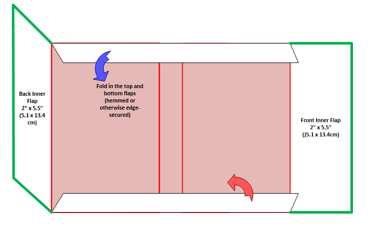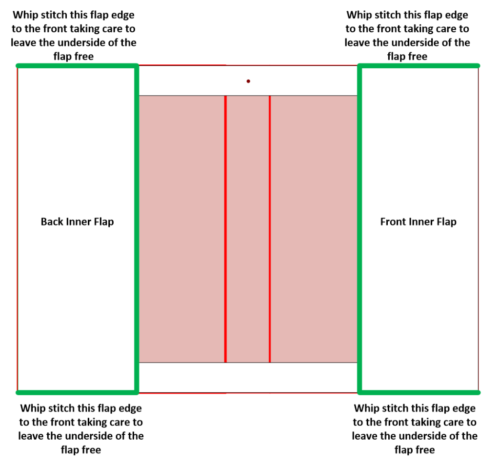 Once everything is all stitched, you can do a gentle wash and iron (nothing with big agitation, harsh detergent, or high heat). Or not. It’s up to you. Now is the time to draw or baste-mark those extra flaps. If you are going to serge them you can mark them and cut to exact size. Note that the ONLY places where secure edge treatment is mandatory are shown in green below. I strongly recommend hemming for those, although serging will work in a pinch. The other edges can be fray check secured or even left plain (they’ll never see the light of day again). Personally, I mark the flaps, and cut leaving a quarter inch seam allowance for the green bits that I turn back and hem, doing a veeerrrryyyy careful diagonal cut at the corner where the front and back inner flaps meet the top and bottom flaps. When I turn back the outer points of the front and back inner flaps and hem them down, I cut off the triangular excess to reduce bulk.