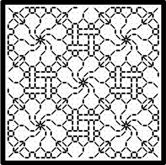 In my method, instead of showing the background grid, I show dots – the “holes” of the ground cloth. If one is working with Aida or Monks Cloth, each hole corresponds to a hole on the fabric. If working with evenweave, the dots represent the spots where a needle would plunge (every 2×2 threads, 3×3 threads, whatever the stitcher chooses to work). I eliminate the grid entirely. The lines that make up the pattern are broken into direct representations of the individual stitches to be taken. I also have the option of flood-filling the background to indicate an area to be overstitched if a voided effect is desired, without obscuring the “counting dots” of the ground (the grey area on the left).