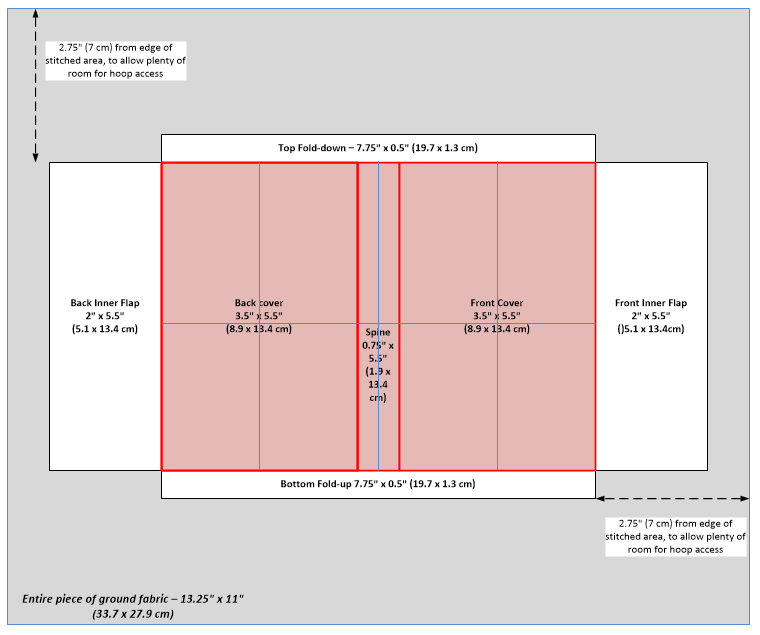 I wanted to know how big a piece of fabric I would need. Having measured a notebook, I did a mockup of the cover, drawing the shapes to size on a piece of paper to make my pattern. I used a brown paper grocery bag to do my layout and mockup (fitting it onto my target notebook to make sure it all worked. That pattern is now long gone, but here’s the logic I used. I strongly suggest making a mock-up and “dry fitting” it before you begin the project, just to make sure that the dimensions work. Note that some books have thicker cardboard covers or heavier spines than others, and may require a bit more “wiggle room” to be added to the measurements below – even if the books have the same general dimensions as the ones I used. If your book is significantly larger than mine you may want to increase the depth of the flaps all the way around. But you should not need to add more than the indicated amount beyond the stitching area (the red rectangle below). The overage of the grey area is just there to provide purchase for a hoop or frame.