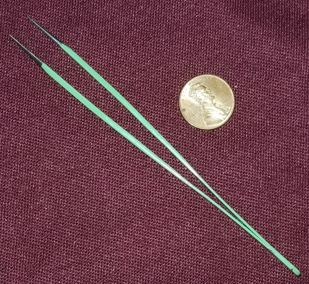 My pair of tweezers is one intended for use in an electronics lab. I found it in the parking lot of a former job, probably dropped by someone testing robots in the back lot. I tried to return it, flogging it around to likely techfolk for several months, but had no takers. Seeing it was to remain an orphan, I adopted it into a new fiber-filled life. I love it. It’s wicked pointy, and even with the dented end (probably damaged when it fell off the test cart onto pavement), does a great job of removing tiny thread bits.