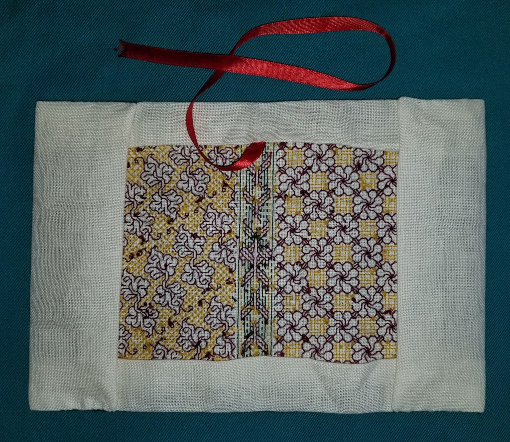 This is a general logic recipe for making a reusable slip cover in for a small notebook, using the same method as the standard brown-paper-bag covers kids of earlier eras employed to protect school-issued textbooks. The basic logic can be adapted to cover any size book. I’ve written this with special steps for counted embroidery project, but any fabric or stitching style can be used.
