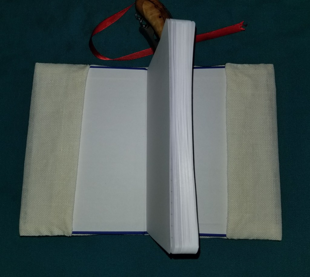 One last refinement. Many of these books come with an elastic loop that can be used to hold the book closed or mark a page. It’s useless in this application. I snip it off the book prior to fitting the cover. Instead, to serve as a bookmark, I stitch on a length of narrow ribbon, attaching it at the little red dot marked on the diagram above.