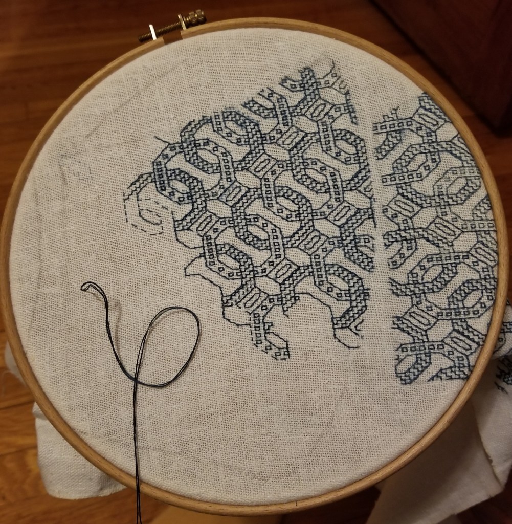 I do a lot of monochrome, much of it modeled on historical pieces. I don’t get to play with multiple colors very often. I’m not a big fan of variegated threads for this type of work. I think the color gradations unless very carefully handled distract from the delicate structure of the stitching, so I’ll stick to solids. And nice, deep, contrasting solids. Two, possibly three colors.