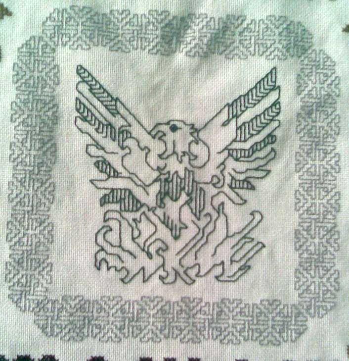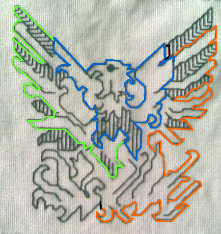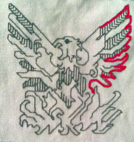 Purists will note that the blue segment might be considered a baseline, with the other elements as detours off of it, but that’s quibbling. For me at least, parsing the pattern into three units helps keep me on track. When I stitched this I started with the blue unit, working the bird’s neck and breast detail as departures from that line. I did have the luxury of not needing to do this piece double sided, so I did begin a new strand to work the green section, stitching the feather striations and other connected bits as I went along. The same with the orange section. I did that last, again working the feather stripe and flame detours as I came to them. The flame section at the pattern’s bottom left is a closed loop departure off of the orange line.