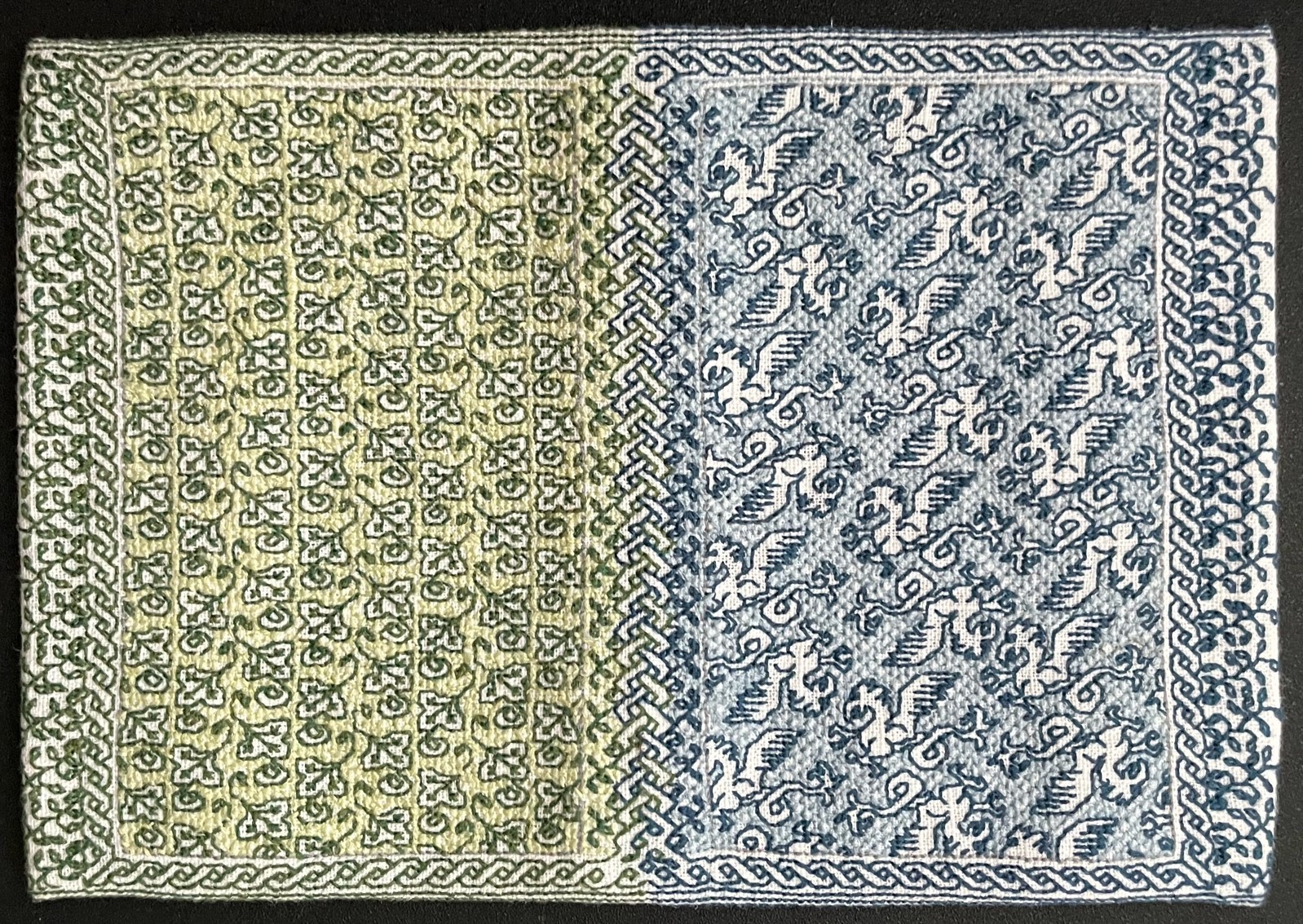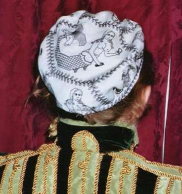 Lady Lakshmi of the SCA embroidered this cap for another SCA participant – Mistress Morewenna Westerne. I do not have permission to share their mundane (street) names. She abstracted the mermaid from TNCM and then adapted it to reflect Mistress Morwenna’s favorite pursuits. Around the edges are a stitching mermaid, a cooking mermaid, a performing mermaid, and others. Very clever!
