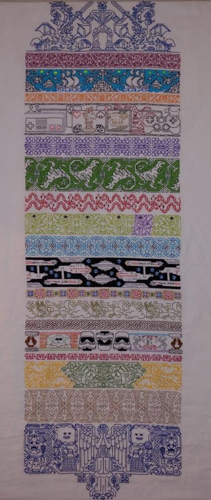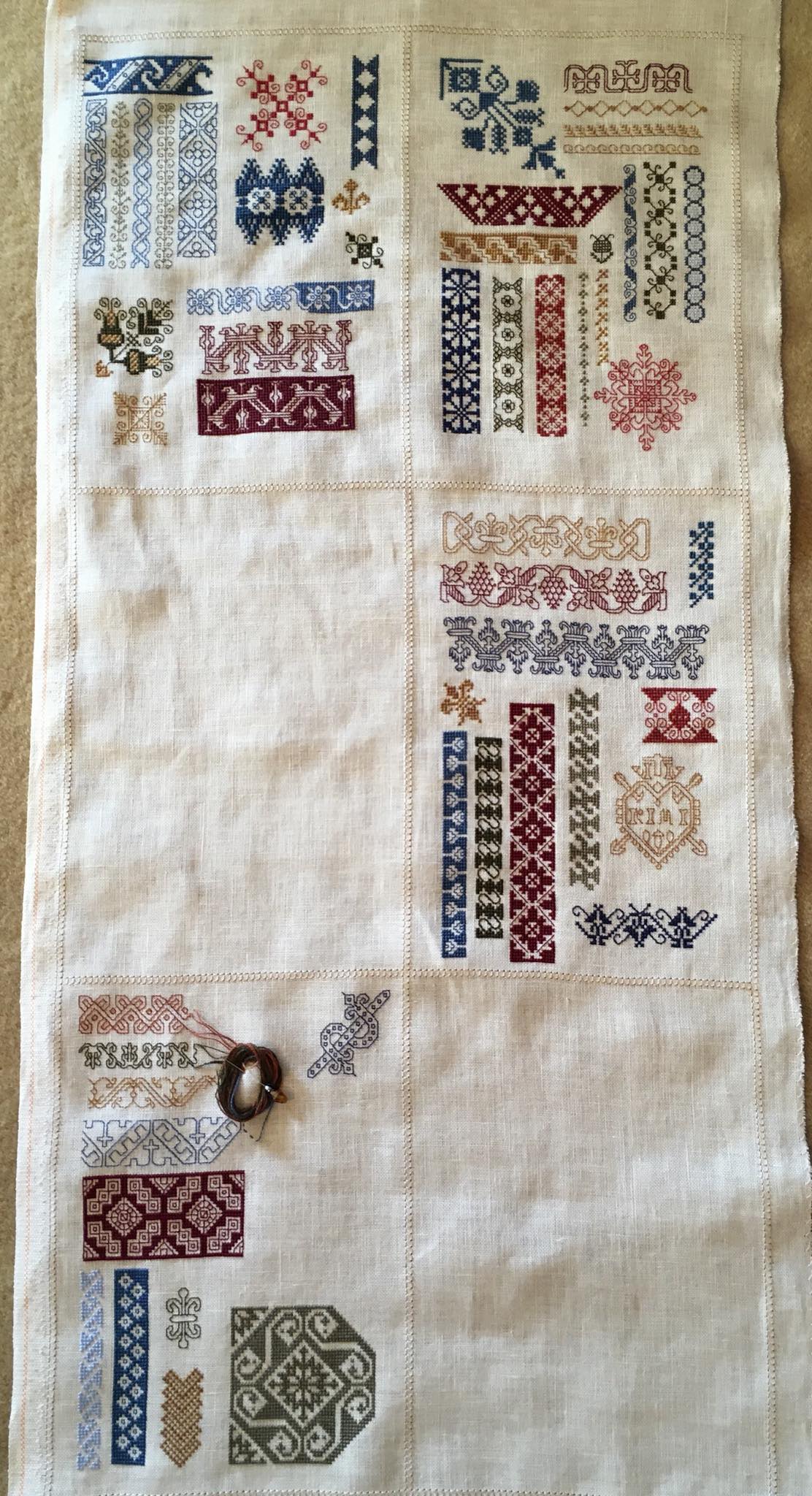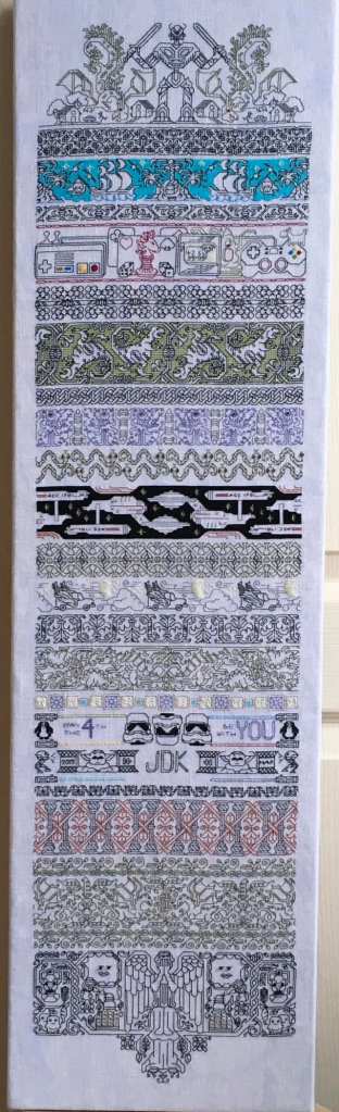 Mary-Anne started with XXX’s Corsica River and subbed two strips from T2CM into the composition – the one at the very bottom and the blackwork band, third from the top.