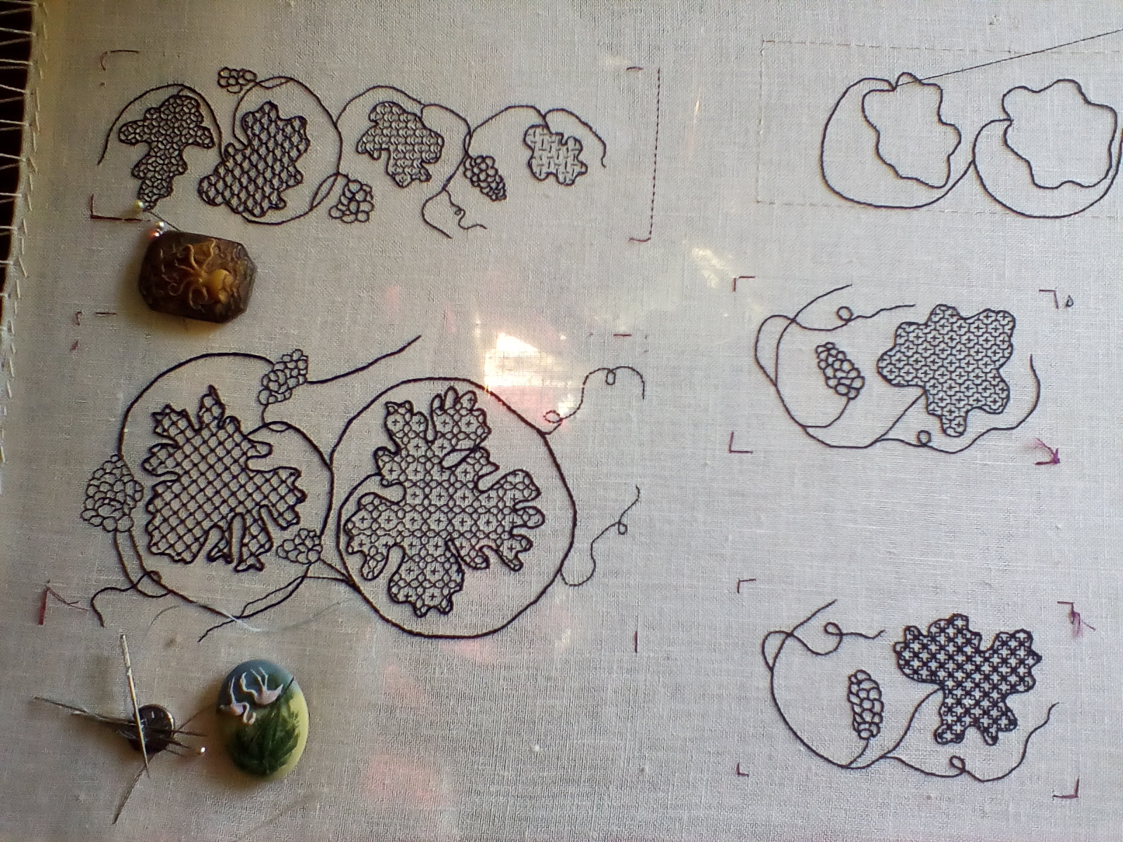 You can see the corner marks for each panel side, the stitcher says that this piece was inspired by a blackworked jewel box embroidered by convalescent World War I soldiers, that was later presented to Queen Mary.
