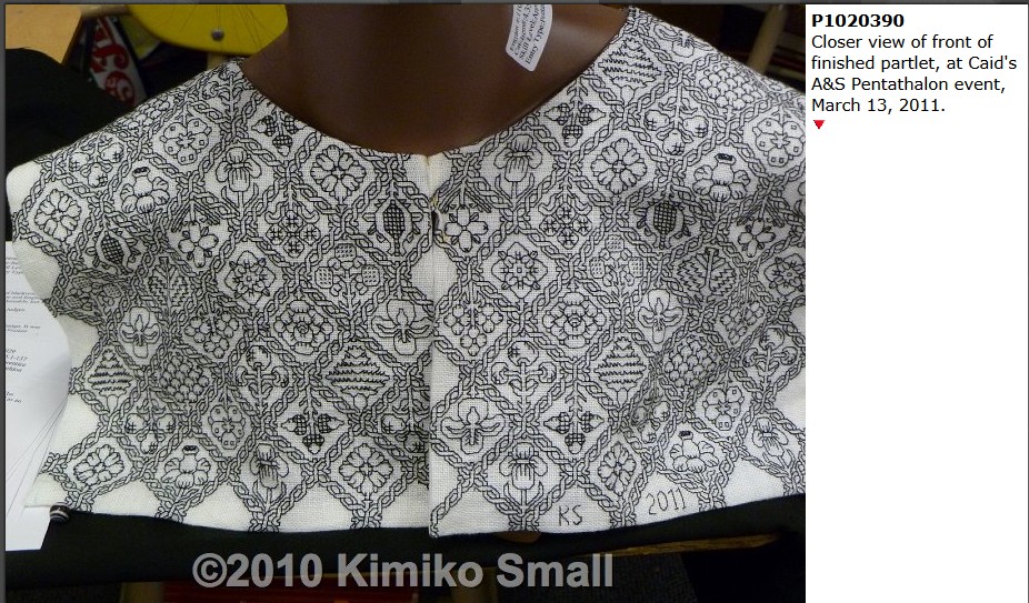 The widely known and lauded leader of the Historical Embroidery group on Facebook, also known under her SCA name of Dame Joan Silvertoppe, did this piece a while back. The stitched design from TNCM, and is a shoulder/bodice covering to be worn with a historical gown. She has a write-up of it here.