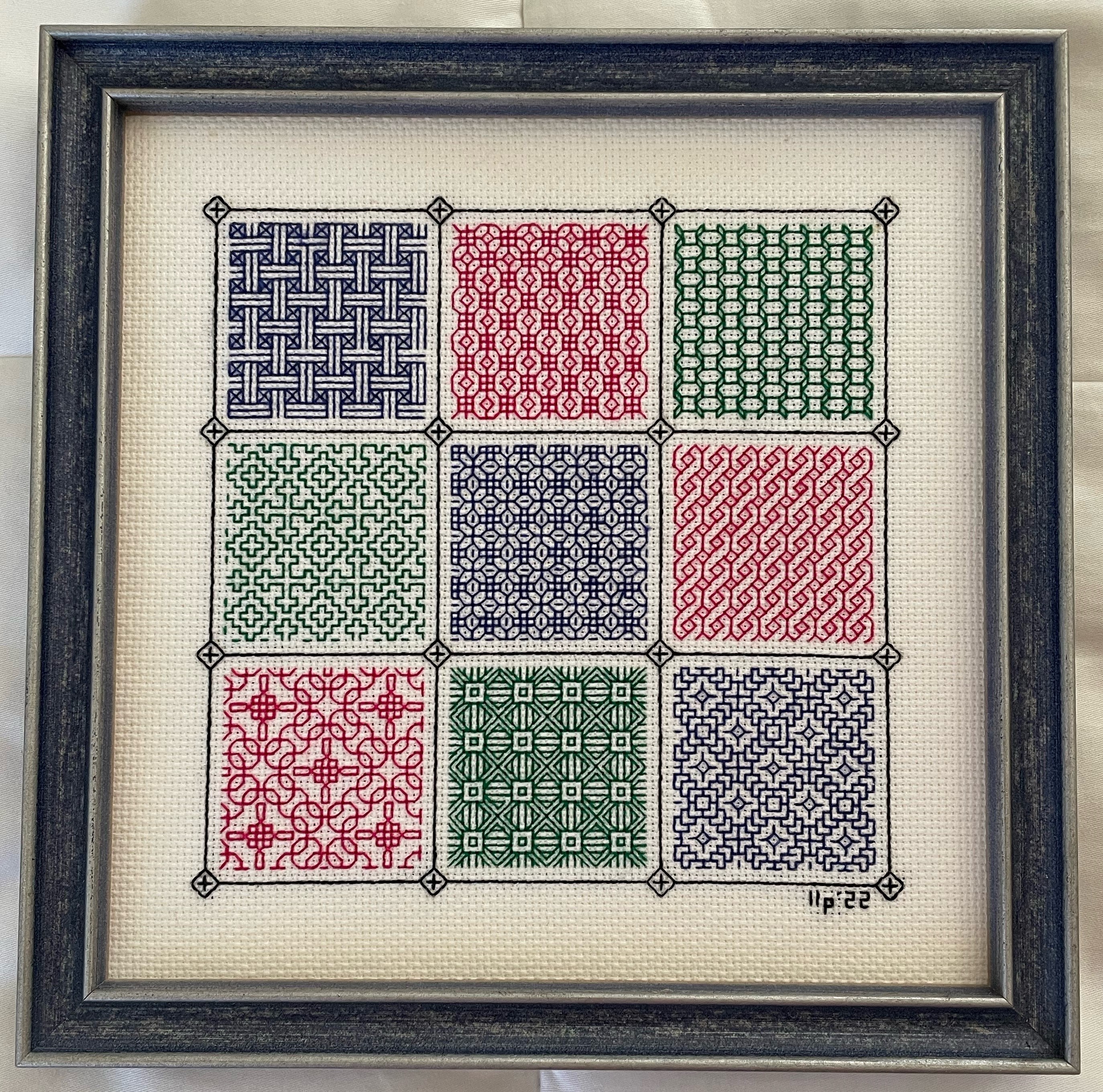 Sarah, of Paine Free Crafts licensed several fills for the glass panels in her design house’s official 2022 Stitch Along. Quite a few people did it. I present her own finish.