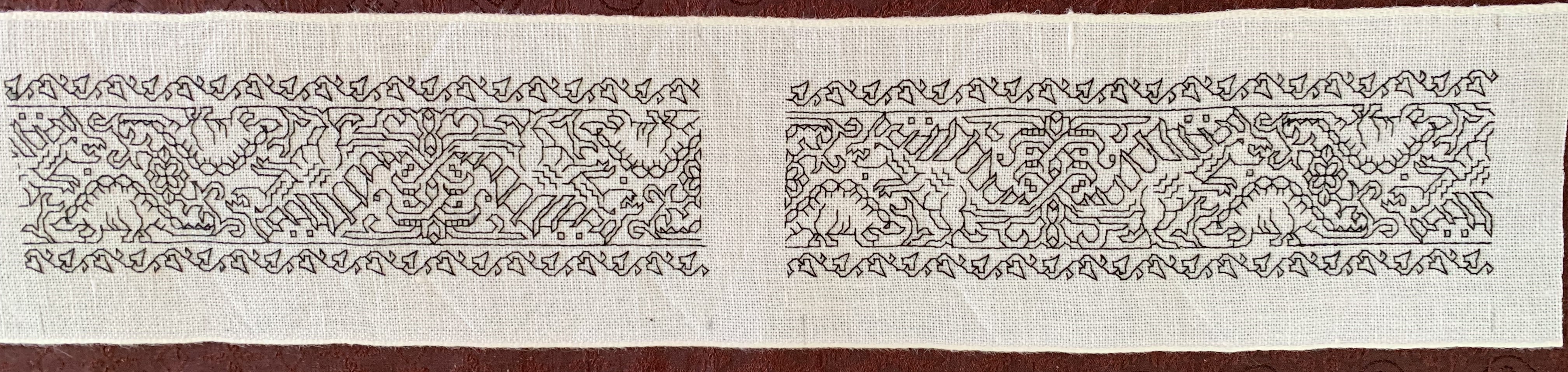 My friend again, auditioning threads and ground counts for another collar and cuffs set, this one based on my dancing skeletons broadside. I believe he went with a different thread choice for the actual rendition.