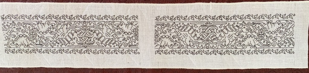 This one is still a work in progress. Mary-Anne is compiling her own version of Metropolitan Museum of Art’s holding 25.92 – pages from a stitched fabric book containing lots of patterns. She worked from transcriptions from several sources – her own among them, and included a couple of patterns I had charted from it for T2CM. Note that the museum’s attribution has changed since I visited that work. When I charted the strips it was credited as “Italian or Spanish, Early 17th century.” It’s now listed as “Probably Portuguese, Early 17th century.” I have included the update in the Errata section on my Books page.