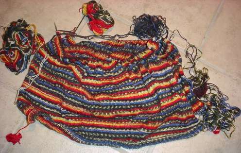 Just to be annoying, Idecided to knit the front and back side by side, althuogh each is knit flat from its own ball of yarn. I wanted the patterning to sort of match at the side seams. I’m not going for absolute fanaticism on this, a rough approximationis good enough. I found comparable spots in two skeins and started on in. It went o.k. for the first six inches or so. Then the problems started.