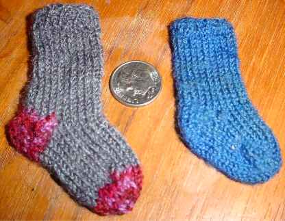 Both of these were knit from the reinforcing yarn that came with Special Blauband. They’re both fully-fashioned toe-ups, using exactly the same figure-8 cast on, short-rowed heel and ribbed cuffs I use to make all of my more wearable socks. I used flat toothpicks to make them, although now in retrospect I probably could have used blunt needles intended for tapestry or needlepoint. Gauge on the gray is something like 14 spi, although it’s tough toestimate accurately. It measures about 2 (5.1 cm) inches from toe to heel, and 2 inches (5.1 cm) from heel to cuff. Little Blue is about 1.5inches (3.8 cm) from toe to heel, and about 1.75inches (4.4 cm)from heel to cuff.
