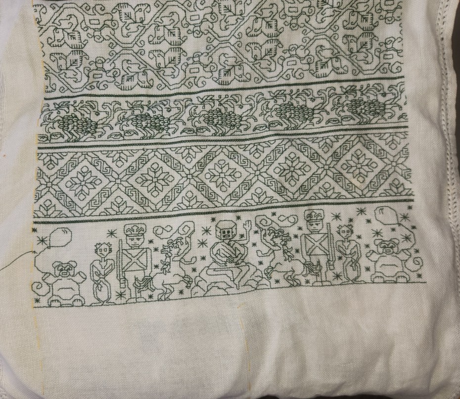 I do have to report an oops. One that dates back to the publication of The New Carolingian Modelbook in 1995. I hadn’t stitched the current strip before, mostly for reasons of size. It’s quite tall. But this being a very long piece of cloth, I thought it would work well on this piece. Lo and behold. There is a small crossings error in the original. It’s small enough to be an easy fix, but I will put redoing that page in queue and eventually publish it in here, and on the errata section on the “My Books” tab elsewhere on this site.