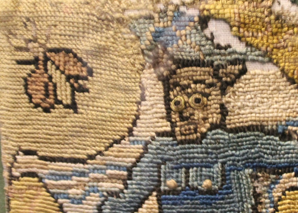 Now, the official descriptions cite “tent stitch” for all of the Oxburgh hangings. But if you look closely at the insect being inspected by the sea monster, it’s pretty clear that cross stitch was employed on this particular slip. Also note that the different parts of the insect were stitched with no regard for maintaining “the same leg on top”. Although some unworked bits just north of the Monster’s head can be seen and counted, we can’t rely on that because the bright white cloth peeking through the stitching is conservator’s ground, onto which the fragile stitching has been affixed. Fortunately, there is a small damaged area just north of the insect where we can see the original fabric: