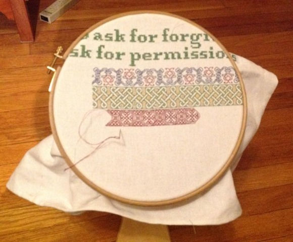 Now it’s just a matter of transcribing my graphed out design to the cloth, using cross stitch for the wording. I’m using two strands of the DMC floss for maximum coverage.