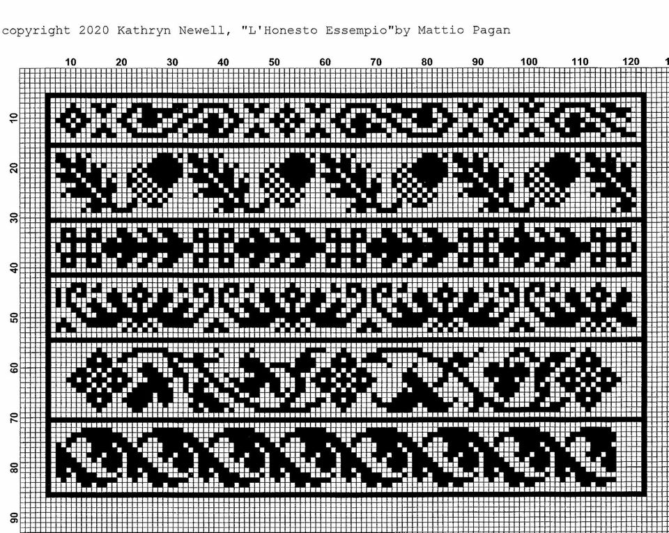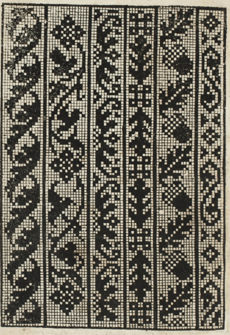 Long time SCA friend/needlework penpal and costuming/stitch research role model Kathryn Goodwyn recently began posting her transcriptions of charted modelbook pages she’s collected over the years. She’s in the middle of a series from Matteo Pagan’s L’Honesto Essampio del Uertuoso Desiderio che hano le done di nobil ingegno, circa lo imparare i punti tagliati a fogliami, published in 1550, in Venice.