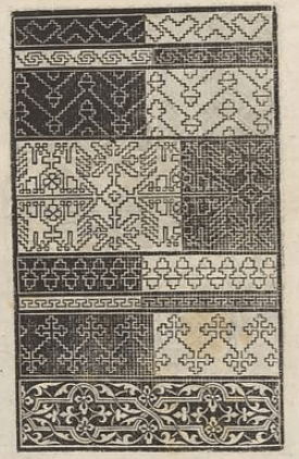 We can also say that these design plates were used by a variety of prolific printers in Germany in response to what must have been continuing demand for pattern books. I say that because they were obviously selling well enough to warrant production over a long span of time, in spite of their largely offering up the same content over and over with only minor supplements. Also, in spite of the sometimes destructive nature of pattern replication at the time these early pattern books survived largely (but not totally) intact. For something so esoteric, with little literary value, they were seen as interesting and useful enough to retain in many libraries – to the delight of those who have rediscovered them again and again across centuries.