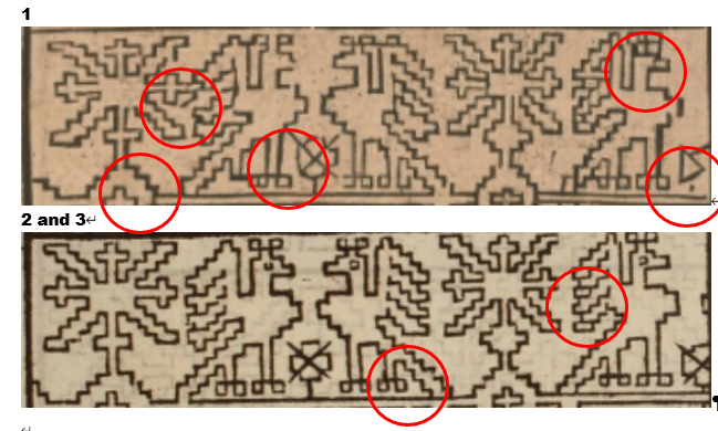 This print looks a lot like the Jost/Konig one, but not exactly so. First, you can dismiss those little white dots. Those are pinpricks, added by someone who ticked off the solid units as they counted. I deduce that because they are also present in many of the empty boxes. But you will notice some oddities. First, the design is further truncated at the right. We’ve lost the complete shield shape bearing the quaternary flower. And the column at the far left has been duplicated. There is also an imprecision on column and row width in this representation, absent on the others. Finally, it’s been formatted for a single print, with no supplemental design below. I’m guessing another plate.