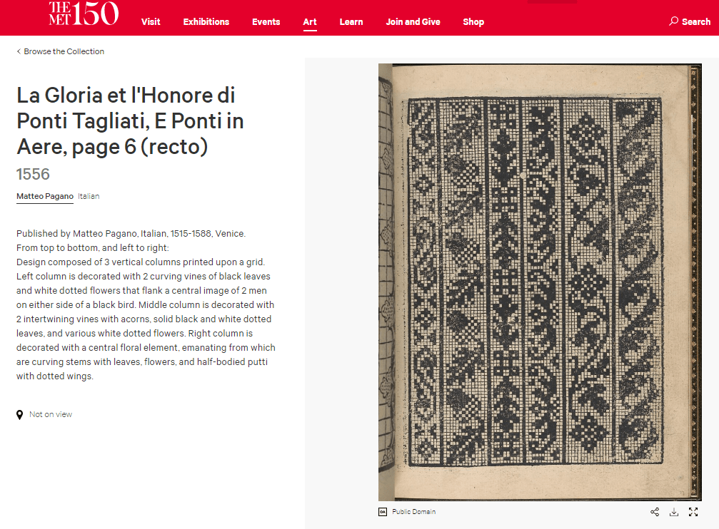 The plate however shows up again in a composed edition of Pagano’s later work, La Gloria et L’Honore di Point Tagliati, E Ponti In Aere (1556) now in the collection of the Metropolitan Museum in New York (Accession 21.59.1). There is some confusion in the museum’s presentation – it’s not clear if this page is included once or twice. There are two images of it each tagged with a different page number, plus one image with no page number tag. On all three the facing pages are identical, as are tiny print imperfections on the pictured plate; which leads me to suspect that (gasp) there is a mistake somewhere in the museum’s on-line listings: